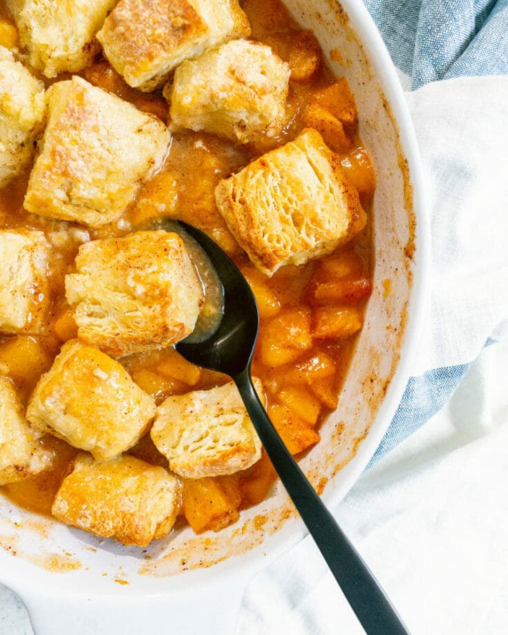 Next up in our baking recipes: a fruit cobbler! Instead of a crumble or a crisp, a cobbler is topped with biscuits. And here's one that's about to be famous: this incredible peach cobbler. Imagine: cinnamon-spiced, ripe and tangy peaches, covered in delightfully flaky ricotta biscuits. It’s truly something special. Also try: Easy Blueberry Cobbler or Skillet Apple Cobbler