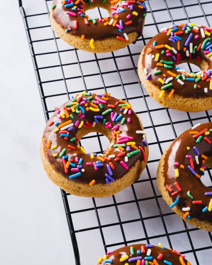There’s no need to run out to the bakery if you’ve got a donut craving. Try Baked Donuts! They’re irresistibly tender, sweet with a moist crumb, and pure perfection topped with a rich chocolate glaze. Add a bit of confetti sprinkles, and what could be more fun? All you need is a donut baking pan and a hankering for a project.