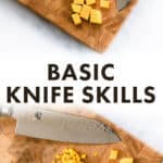 Before you start with your basic knife skills, let’s talk cutting boards. It’s important to have a good cutting board with non-slip feet. Without this, the cutting board can move while you’re cutting, making the knife unstable and increasing the risk of cutting yourself! (If you don’t have a cutting board with non-slip feet, place a damp towel underneath the board.) Here are a few of the best cutting boards we recommend: