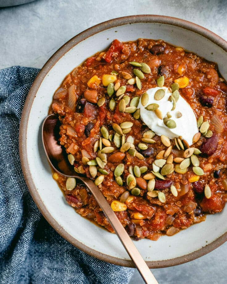 Chili is an easy way to eat a gluten-free dinner! And this savory, hearty chili is full of good-for-you ingredients: trio of protein-packed beans, quinoa, and loads of spices. And of course, the toppings are where it's at in chili. We like a dollop of sour cream (or vegan sour cream) and hot sauce and crunchy roasted salted pepitas. Or try homemade tortilla strips for another way to add a crunch.