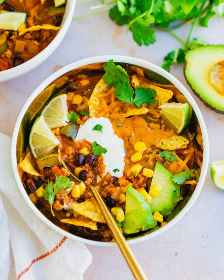 If you love tacos and you love soup…well, taco soup is a no brainer! It’s a Tex Mex invention like taco salad, basically a mashup between a Mexican tortilla soup and American chili. Each bowl is warming, savory and smoky, and a cozy canvas for toppings like sour cream and crushed tortilla chips. The best part: it’s done in 30 minutes and customizable for eaters of any diet!
