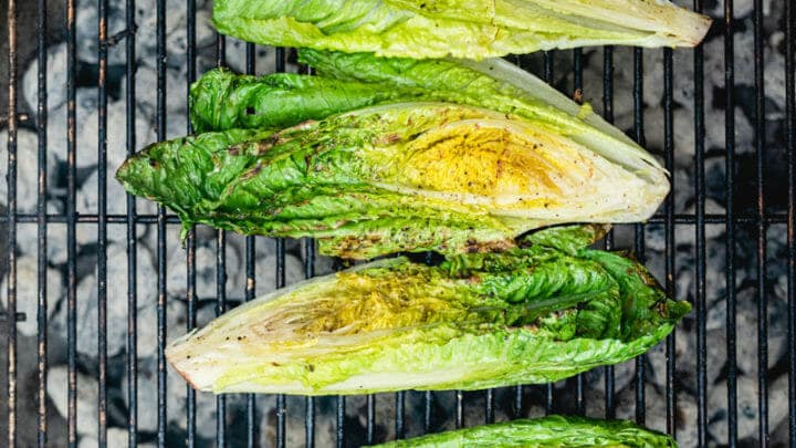 Somehow grilling romaine lettuce brings out an unexpectedly beautiful smoky flavor in this leafy green! It's easy to make and a simple appetizer or side dish. You can even make it into grilled Caesar salad topped with tomatoes and Caesar dressing.