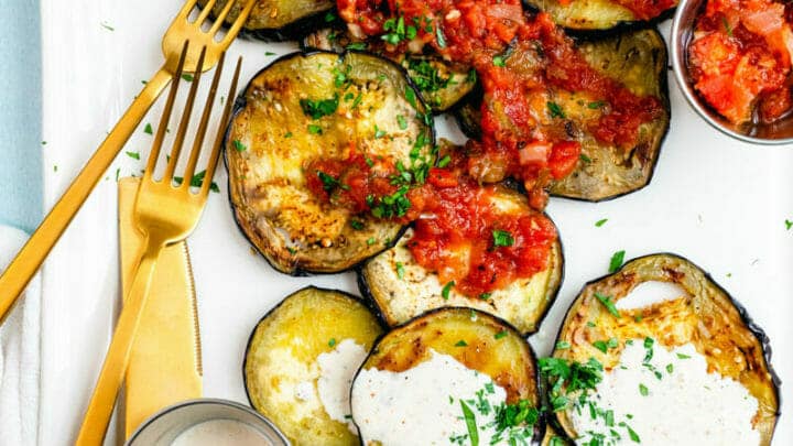You’ve got to try this grilled eggplant: it comes out smoky and tender, lightly charred and full of flavor. Top it with a sauce and you’ve got a killer summer side dish or appetizer! Try with a fresh tomato salsa fresca or a creamy, lightly spicy white BBQ sauce.