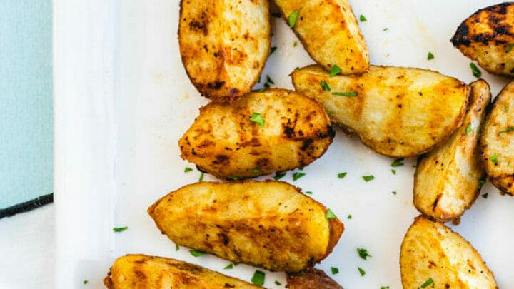 Crisp on the outside and tender on the inside, these potatoes have a smoky char and are absolutely delicious! Cut into wedges, they’re the perfect side dish for a grilled dinner on the patio.