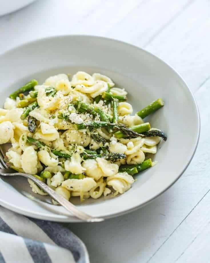 In Italian, orecchiette means “small ears”; it’s a small cup-shaped pasta. Here we’ve used it to make a lemon asparagus pasta with feta cheese and olive oil. What we’ve learned from our travels to Italy: simple is best. A few flavors elegantly combined can taste better than something that has taken all day to prepare.
