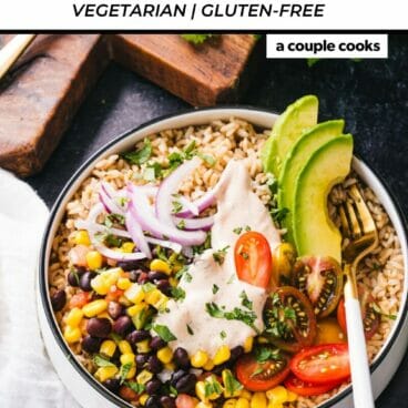 The best part about a burrito bowl, in our opinion? You can customize it to any diet. In fact, you can make these bowls for a crowd and provide options for everyone. It’s absolutely our go-to for large gatherings! As is, this burrito bowl is vegetarian and gluten free. Here’s how to modify it for other diets: