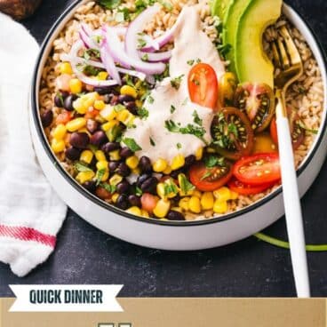 Here’s a quick dinner idea that’s always satisfying and works for nearly every diet. That’s right, the good old Burrito Bowl! We can thank Chipotle for its widespread popularity, but it really is a killer idea. Throw rice, veggies, and burrito fillings in a bowl and call it meal! Here’s the thing: a good burrito bowl can actually take a while to make at home with all the components. Want a burrito bowl that’s lightening fast to make? We’ve got you. In fact, you can make this one in 15 minutes (we timed ourselves).