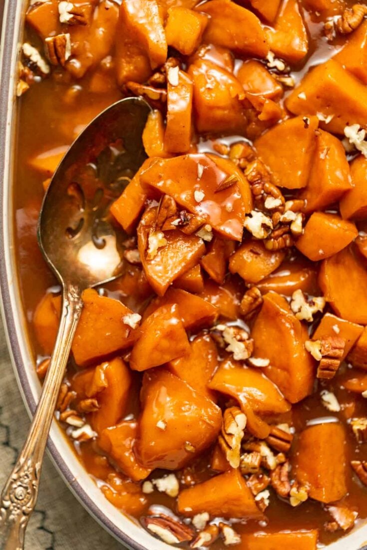 These Old Fashioned Candied Sweet Potatoes are a classic soul food dish. Melt-in-your-mouth sweet potatoes are baked in a buttery brown sugar glaze with warm spices and vanilla. Delicious! via Britney Breaks Bread