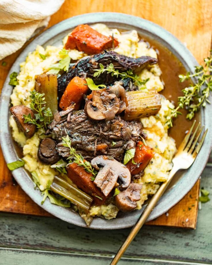 This oven baked chuck roast makes an easy and comforting Christmas dinner! Juicy fork tender beef is braised in red wine with carrots, celery, onions, garlic, and fresh herbs for an all around delicious, classic dish. (Gluten-free) via Britney Breaks Bread