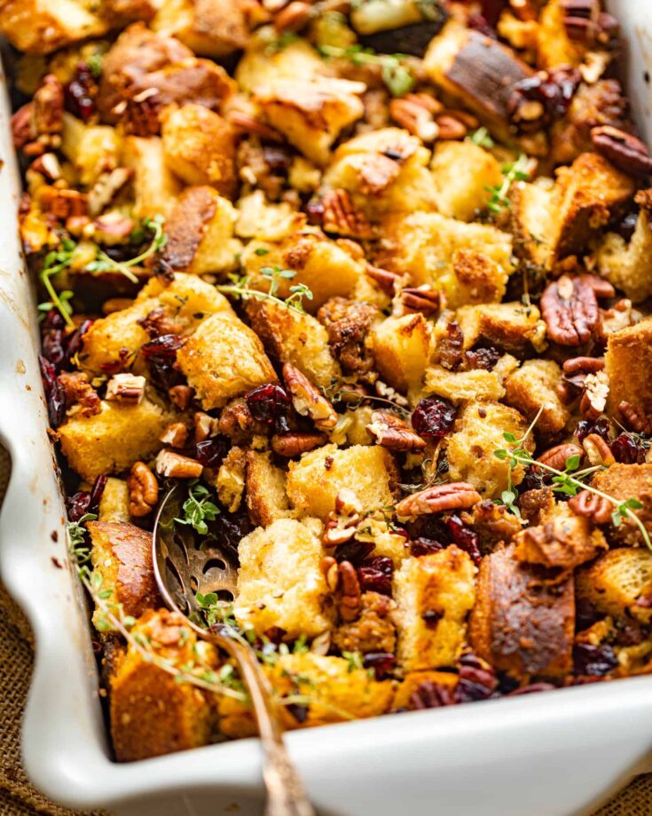 This sourdough stuffing recipe is a flavor packed homemade stuffing that's perfect for Christmas dinner! It's made with sausage, fresh herbs, and topped with pecans and dried cranberries for a sweet and savory twist. via Britney Breaks Bread