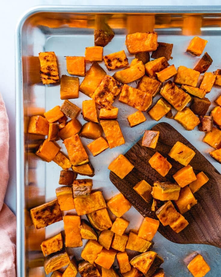 All hail the sweet potato! This healthy orange vegetable is super versatile: bake it into crispy fries, stuff it with black beans and salsa, or boil it in a hearty stew. But one of the best ways to cook a sweet potato? Make Oven Roasted Sweet Potatoes! Dice them up, season with care, and roast until they’re browned and caramelized on the outsides.