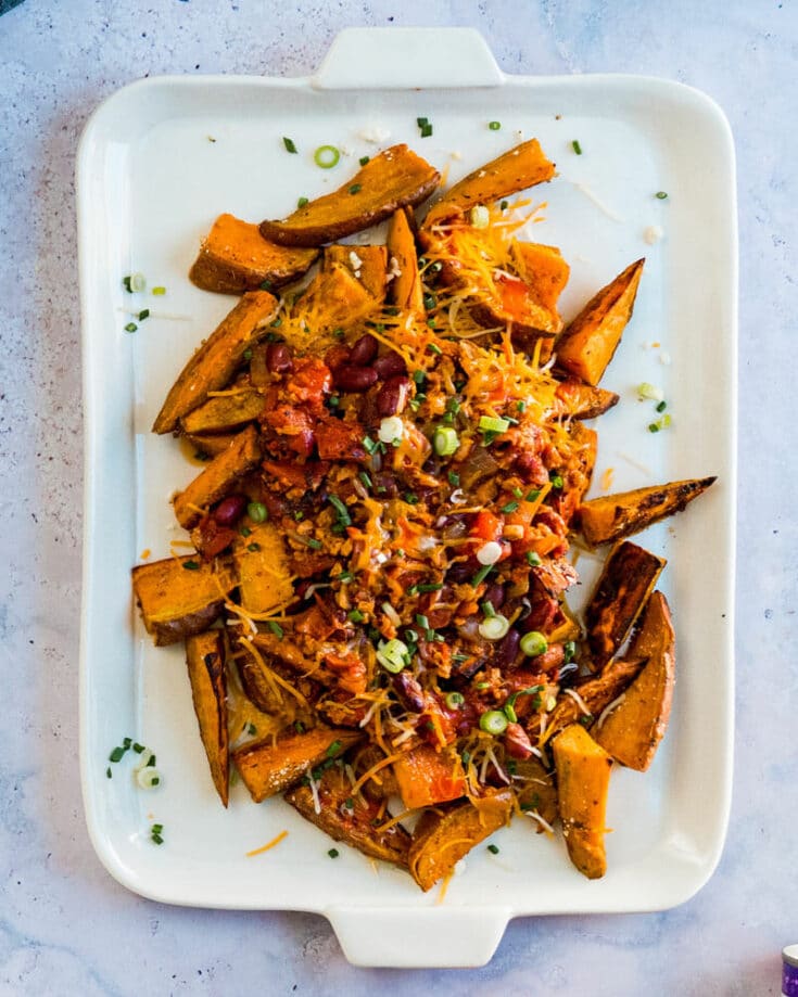 Make a pan of our irresistible sweet potato wedges, lightly crisped and seasoned to perfection. Then main dish by adding toppings (double yum!). Add the black bean chili above or this Quick Chili, then add cheese and salsa. Kids love it!