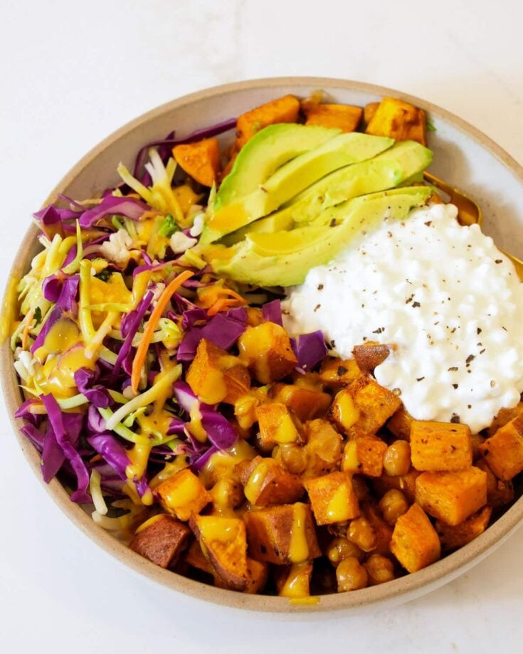 These veggie protein bowls are my go-to weeknight family dinner that’s nutritious, filling, and quick! They feature roasted sweet potatoes and chickpeas, creamy cottage cheese, and a drizzle of honey mustard sauce.