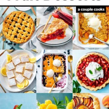 Are you a fruit dessert person or a chocolate dessert person? Over here one of us is the fruit dessert person (Alex) and one is the chocoholic (Sonja). But there’s something so special about the fruit of the season: like desserts you only make for a few weeks per year! So here are the best fruit desserts we’ve made, featuring all the bounty of the season: juicy peaches, sweet tart blueberries, tangy cherries, bright red strawberries, and more!