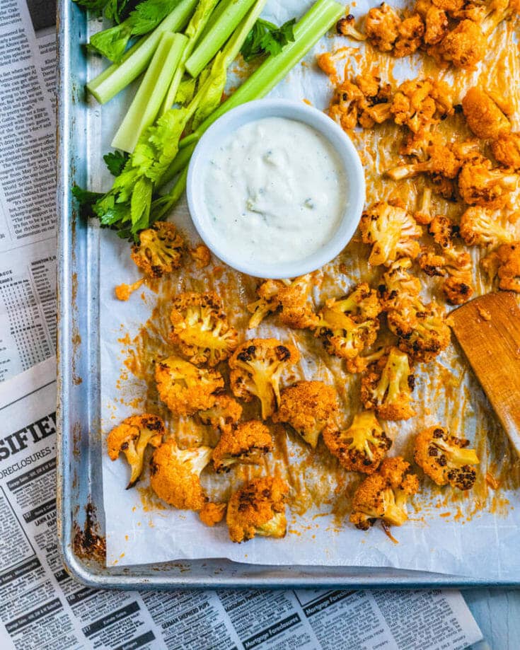 This buffalo cauliflower doesn’t taste like a sacrifice in the least! This gluten free appetizer recipe is a great alternative to buffalo chicken dip, which is tasty but can be high calorie. Simply roast up your cauliflower and slather it in blue cheese dip: it’s a healthy snack that tastes seriously indulgent.
