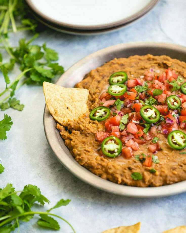 This gluten free appetizer is so creamy and irresistible, you'll be amazed there's no cheese to speak of! Somehow it’s just as satisfying as a cheesy Mexican dip, without the extra calories. You can use either Instant Pot refried beans, stovetop refried beans, or canned refried beans, then mix them with green chilis and cumin. Top it with salsa fresca and it's a healthy spin on a bean dip that's seriously satisfying.