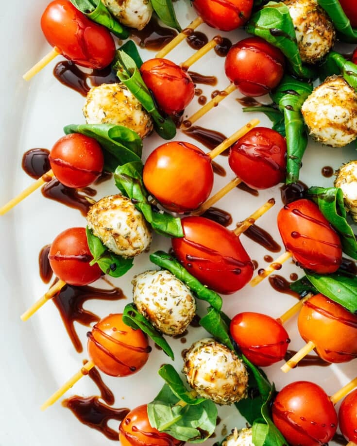 Here’s a fun summer appetizer that pleases nearly everyone: Caprese Skewers! This easy recipe is visually stunning and irresistibly tasty, spearing all the components of a Caprese salad onto a skewer. There’s nothing better than basil and tomatoes in summer, and combined with seasoned mozzarella and a balsamic glaze: you won’t be able to eat just one!