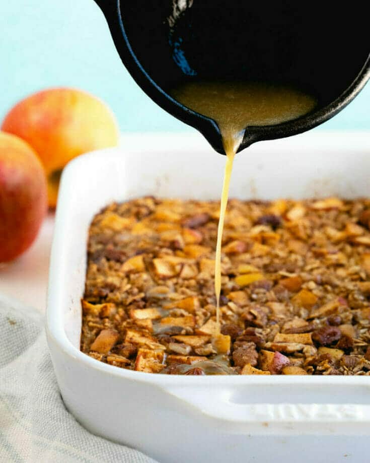 *Make ahead instructions: do not make the entire pan in advance and refrigerate overnight because the oats will absorb all the liquid. You can mix up the wets and dries separately and store in separate containers (with the wets refrigerated), then pour them together in the morning and bake.