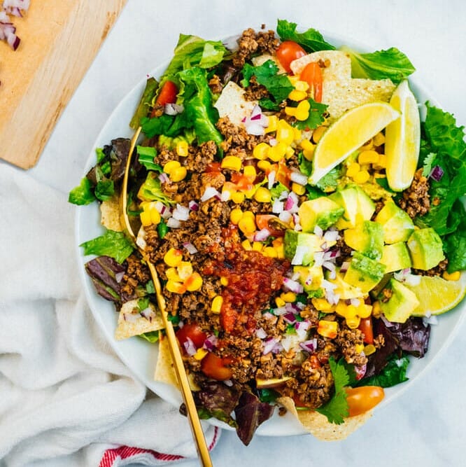 On the lookout for easy gluten free dairy free dinner ideas? Vegan Taco Salad to the rescue! This genius recipe comes to you by the magic of Walnut Taco Meat: a tasty way to make a plant-based version of ground beef. Turns out, walnuts, mushrooms and spices do a spot on job of simulating the savory goodness of meat crumbles. Top with salsa and enjoy.