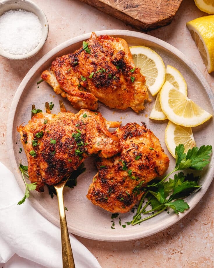 “Life changing” is a phrase that’s completely over-used, but here’s a little kitchen trick that we think truly is…yep, life changing. Try this incredible oven baked chicken thighs recipe! This easy method is the secret to perfectly seasoned meat with a crispy skin and juicy, succulent interior.