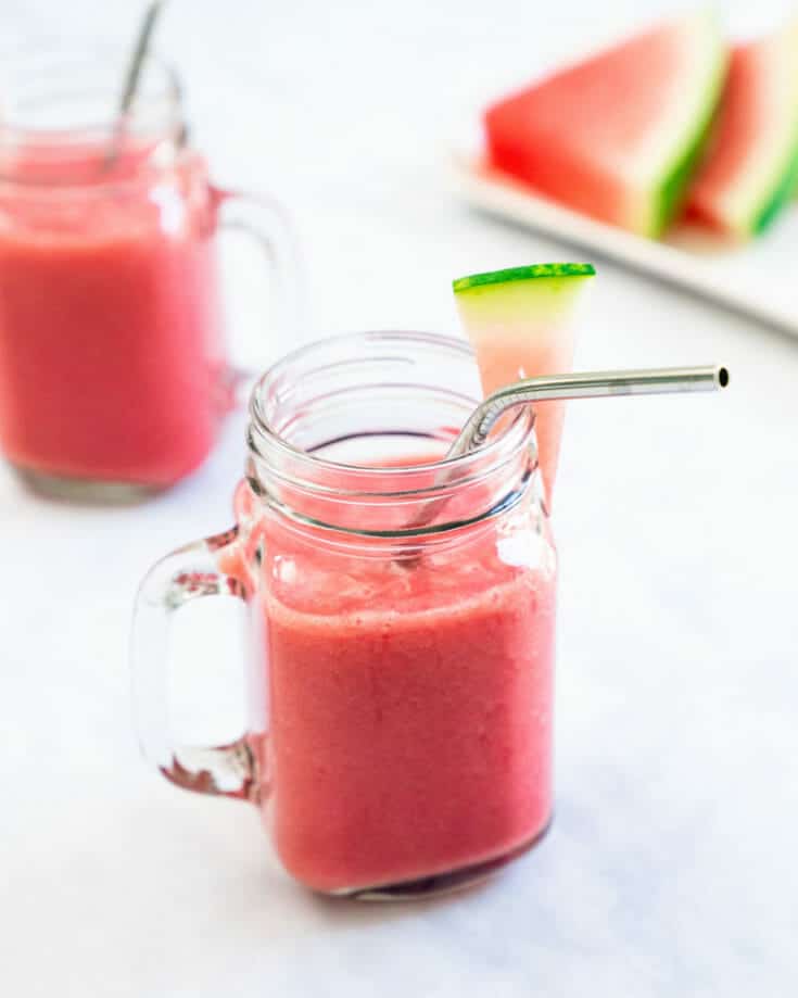 This 3-ingredient watermelon smoothie recipe is juicy and lightly sweet! Make it with seasonal melon, frozen strawberries and banana for just the right texture. Watermelon is full of vitamins and nutrients, and its naturally sweet flavor adds a delicious, almost tropical flair to a smoothie.