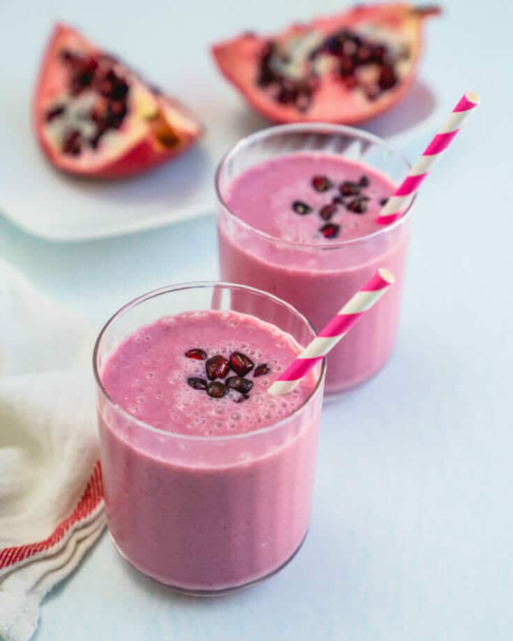 This delicious pink drink is bursting with fruity flavor and one of our favorite ways to use pomegranate seeds. It pairs the jewel-toned seeds with frozen pineapple and banana to make a creamy puree that’s full of nutrients and vitamins.