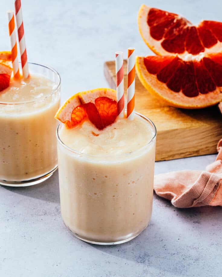 This healthy drink will take you by surprise with its light, refreshing flavor: a grapefruit smoothie! This lusciously fruity puree tastes a like a combination of sorbet and ice cream: bright and zingy from the grapefruit, tropical from the pineapple, and creamy from the banana.