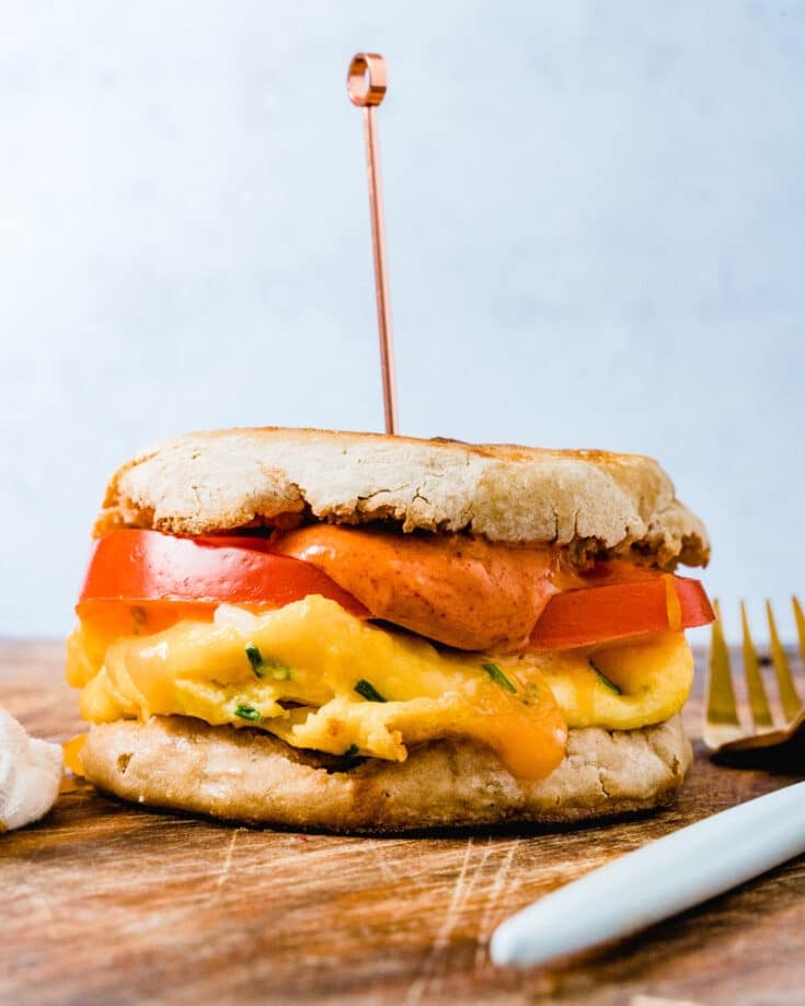 This 5 minute breakfast sandwich recipe makes mornings easy! Fluffy, cheesy eggs pair perfectly with a slather of smoky mayo.