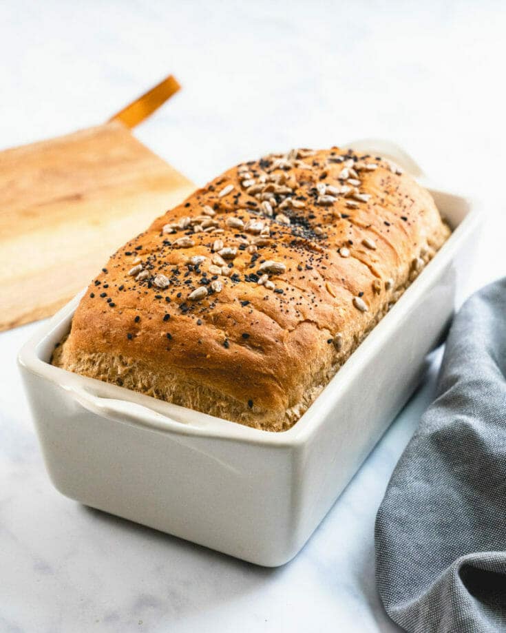 It’s truly easy compared to other bread recipes! This multigrain bread is made with some rye flour and has tasty mix-ins like oatmeal, sunflower seeds, and quinoa.