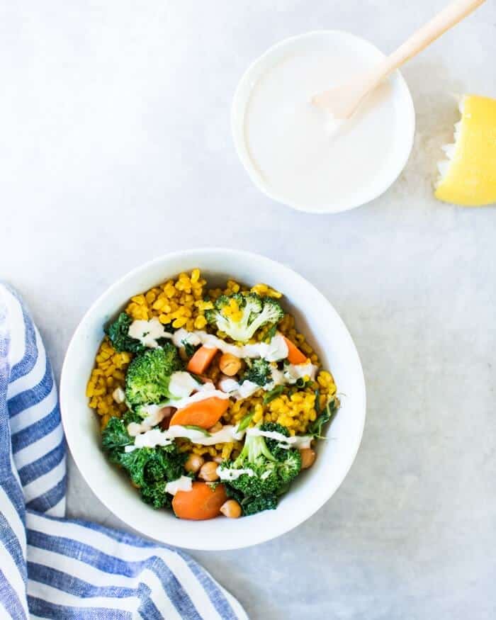 These turmeric yellow rice bowls are healthy and delicious, filled with bright yellow rice and colorful veggies like carrots, brocolli, chickpeas, and kale. To top it off, drizzle over our fan favorite creamy and tangy lemon tahini sauce.