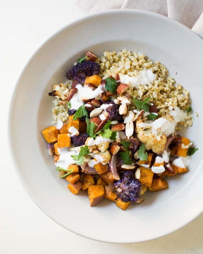 And last but not least in our salads for dinner: this roasted vegetable bowl! This roasted vegetable grain bowl stars our absolute favorite roasted veg: cauliflower, sweet potato, and red onion, mixed with Moroccan spices.