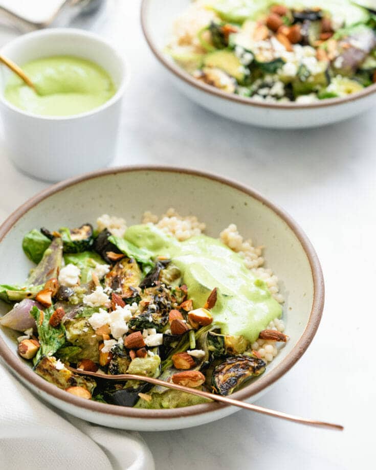 This main dish salad for dinner is incredibly flavorful and the perfect way to get your veggies and grains. This Green Goddess salad is all about using up leftover grains and veggies from the week or weekend. You can literally make it with any grain: some of our favorites around here are brown rice, quinoa, millet, or farro. Then use any veggies you have around: this recipe shows you how to grill eggplant, red onion , and zucchini. It's stunning!