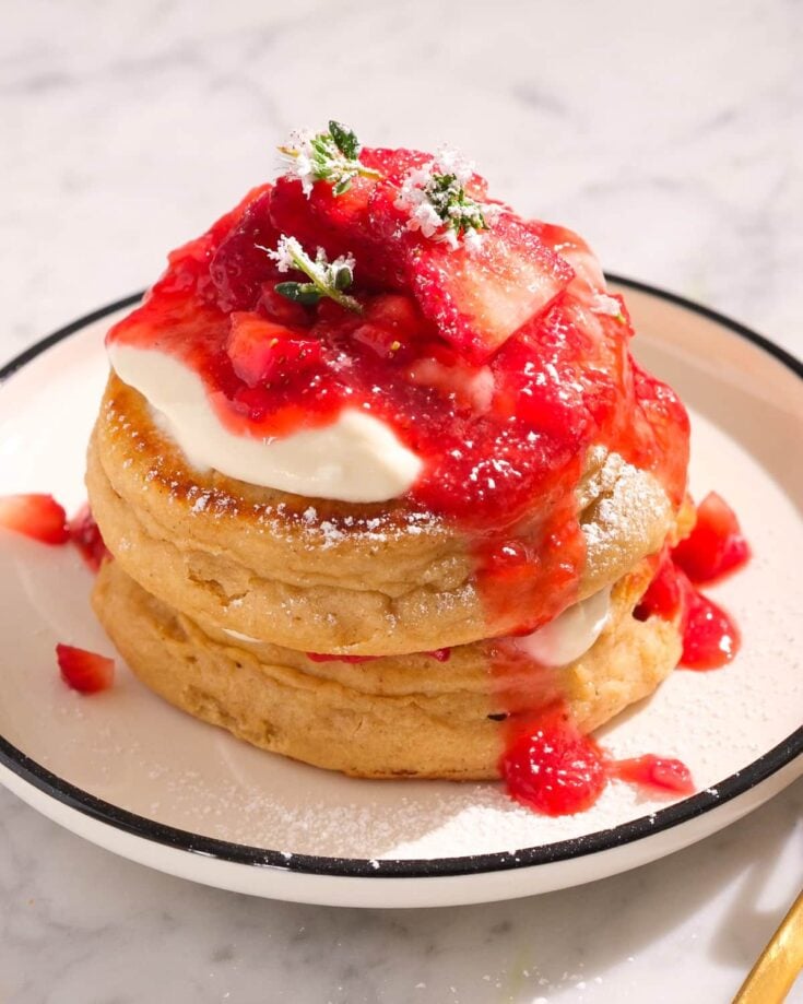 These strawberry shortcake pancakes make the classic dessert into a healthy breakfast! Made with oat flour and topped with strawberry sauce and Greek yogurt, they’re a nourishing spin that everyone in our family goes crazy for (and you will too!).