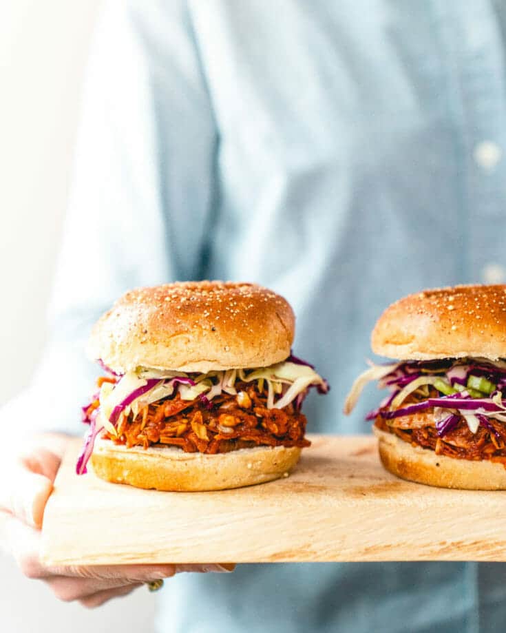 Here's a comfort food sandwich recipe at its finest: a gooey, tangy BBQ sandwich! Jackfruit stands in as pulled pork, and it's so good you might even fool some meat eaters! You'll make a homemade BBQ sauce with a splash of bourbon, then add the jackfruit and simmer until it's tender and looks just like pulled pork.
