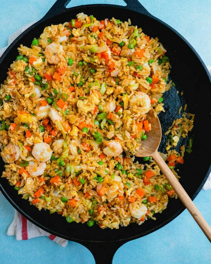This shrimp recipe is all about comfort food vibes: Shrimp Fried Rice! It’s relatively healthy and over the top delicious. The garlic, ginger and soy sauce meld perfectly with the colorful veggies, bursts of shrimp and gooey bits of egg into a symphony of flavor. It’s one of our favorites for weeknight cooking…ever.