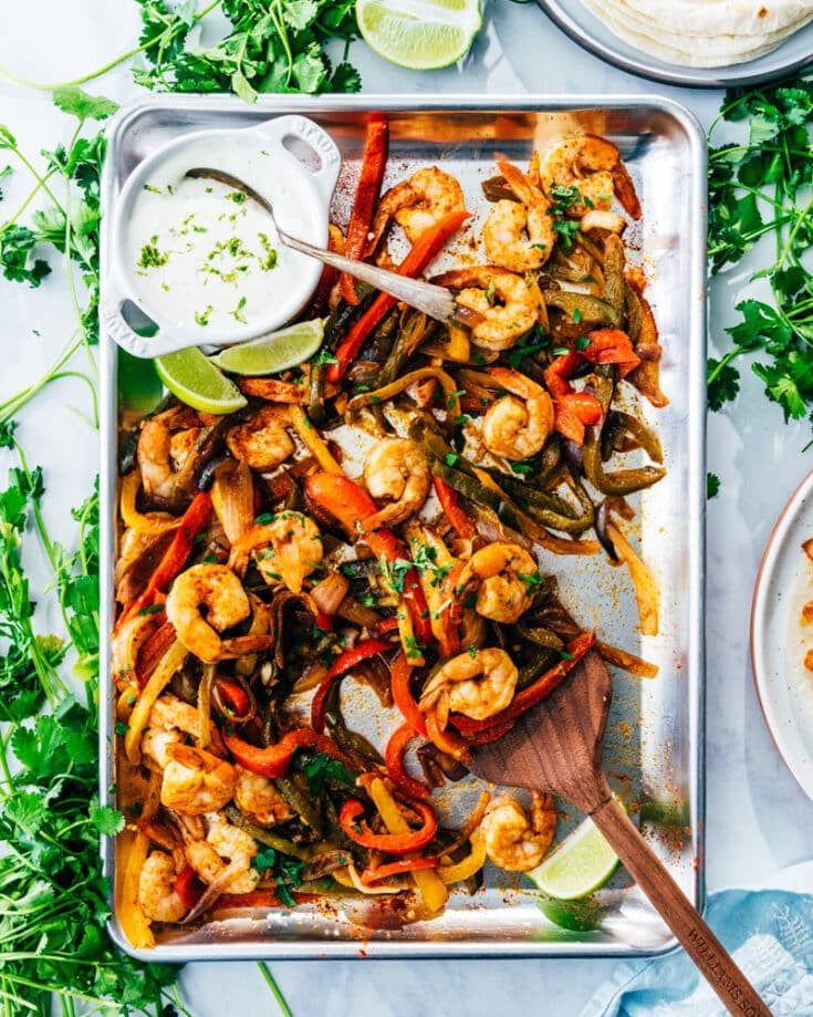 These Sheet Pan Shrimp Fajitas are perfect for an easy weeknight meal! This Tex Mex favorite is delicious in a skillet, but it’s even more fun on a sheet pan. The shrimp comes out juicy and succulent, and everything is infused with an irresistible combination of spices. Wrap it up in a soft tortilla with lime crema, and it’s a total crowd pleaser.