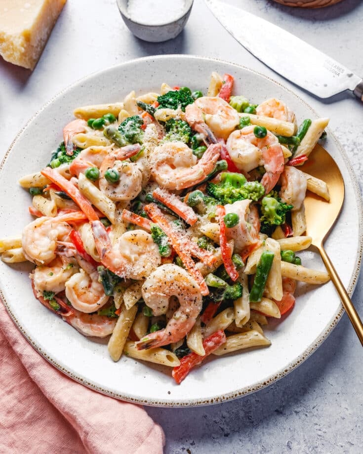 Try pairing this juicy seafood with pasta and fresh vegetables in this shrimp primavera. It’s like a classic pasta primavera with shrimp added, and smothered in a light creamy sauce, it makes a simple satisfying dinner in just 30 minutes.