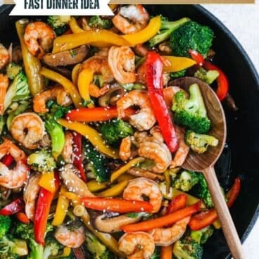 There are lots more veggies you can add to customize this shrimp stir fry. But keep in mind, it’s important not to overstuff your pan! More veggies is not necessarily better. Using too many makes them stack on each other and steam instead of stir fry, resulting in soggy veggies. Use your largest skillet and approximately 6 to 8 cups of vegetables total.