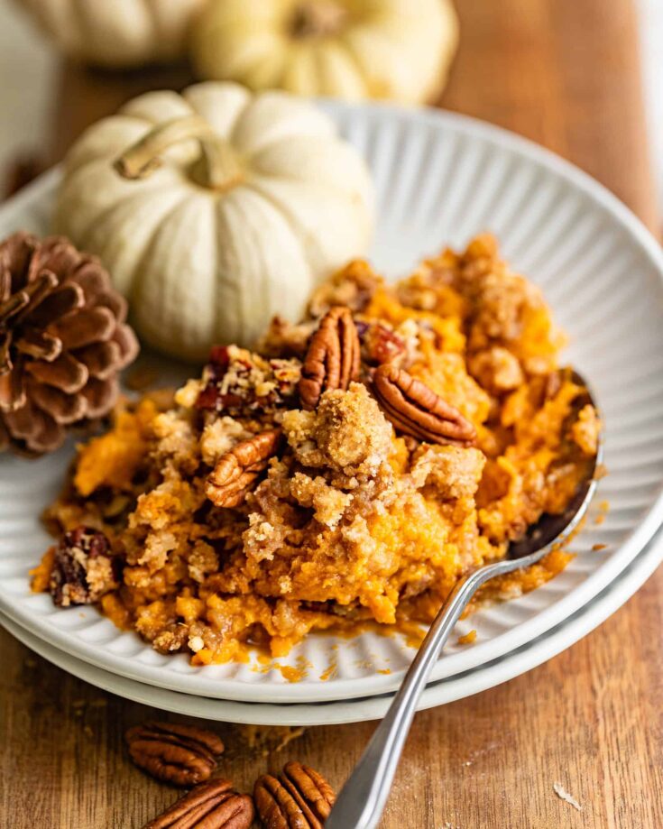 Of course, there's always the classic sweet potato casserole as a way to use this potato! This one is a traditional sweet potato casserole with a splash of bourbon and topped with a crunchy pecan streusel full of brown sugar, cinnamon, and nutmeg. via Britney Breaks Bread