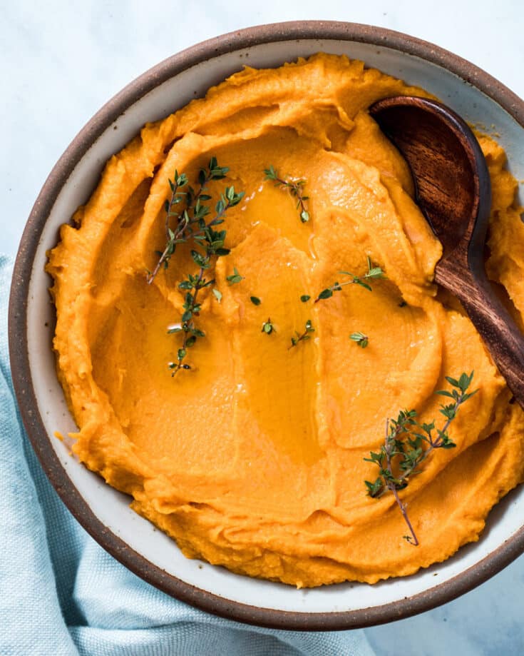 Here’s a creamy side dish that’s perfect on any plate: Sweet Potato Puree! This lusciously creamy puree is light and sweet: ideal for serving with a savory protein like roast chicken or seared fish. It tastes restaurant style: especially when you serve the protein perched on top! Serve it at fall meals and it will be the talk of the table: we promise!