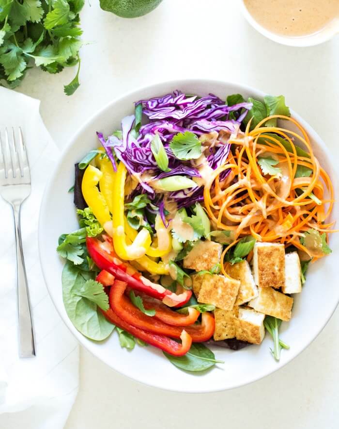 This vegan Thai salad is a fresh and delicious way to eat salad for dinner! This main dish salad features crunchy colorful vegetables and crisp-sauteed tofu, smothered in a creamy peanut sauce dressing. Then it's all topped with peanuts, cilantro, and lime. There’s a lot going on in this bowl!