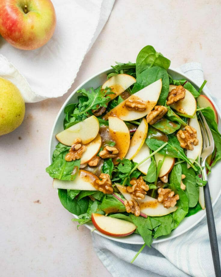 This spinach apple salad is one of our top vegan salad recipes because it's classic and simple! It pairs tangy apple and thin sliced pear with spinach and a zingy balsamic dressing. The best part? Top it with shiny glazed walnuts or glazed pecans, which add a signature crunch.