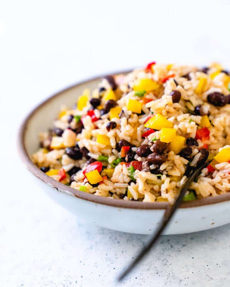 This vegan black bean salad is tangy and delicious, perfectly seasoned with cumin, garlic, and vinegar. Then it's mixed with colored bell peppers, green onions and rice! It’s kid friendly and a great healthy lunch idea or dinner time side. It stays in the fridge for up to 3 days, and the flavor improves over time.