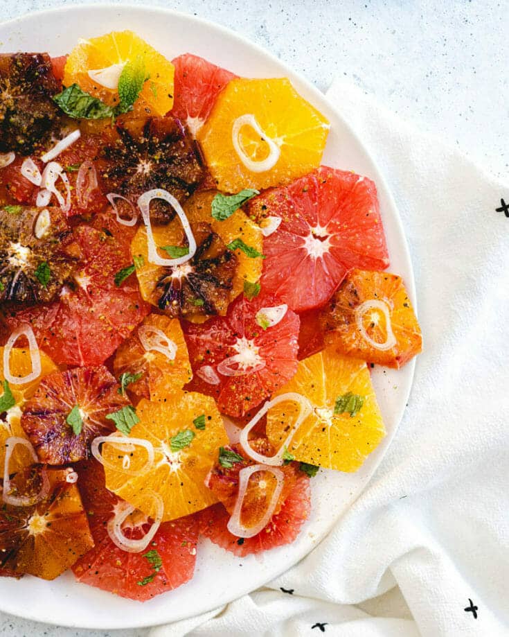 Here’s a refreshingly simple vegan salad recipe that’s just begging to jump on your table: citrus salad! It stars all the beautiful, vibrant citrus: tangy grapefruit, navel oranges, and sweet blood oranges. They’re drizzled with a zingy dressing, then topped crushed pistachios and fresh mint.