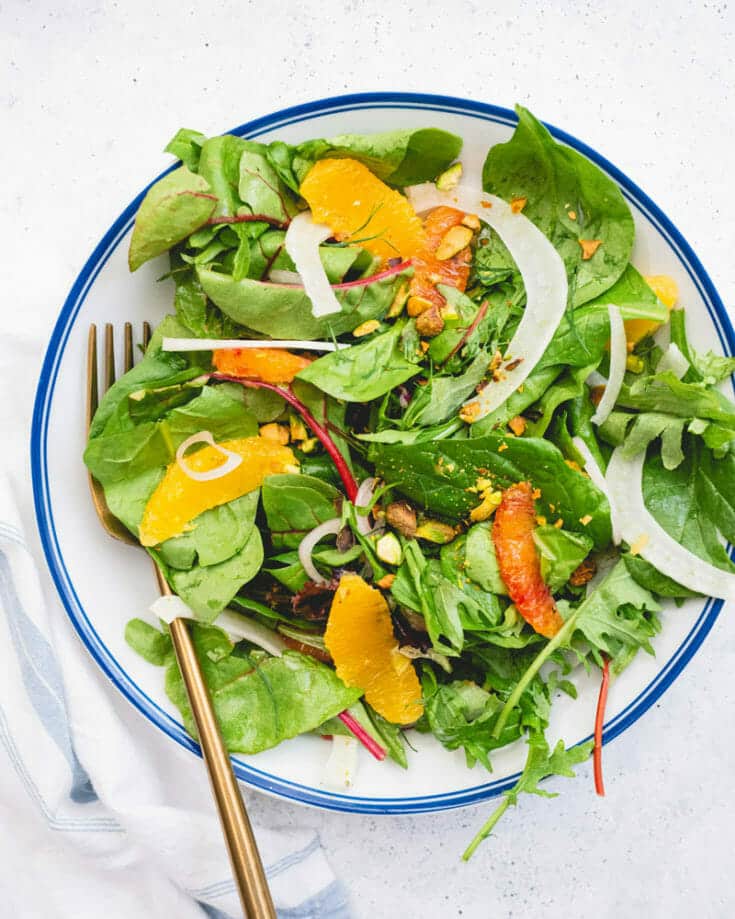 This fennel orange salad is one of our favorite vegan salad recipes because it's so bright and vibrant! Juicy oranges pair with sliced raw fennel, which adds a subtle licorice essence. Throw it over greens with pistachios and shallots, and top with a zingy homemade citrus vinaigrette. There’s so much going on flavor and texture-wise, it's a salad everyone will be talking about.