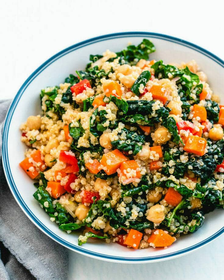 This kale quinoa salad is a hearty vegan salad recipe that's perfect for lunches or side dishes! It's easy to make and stays good in the refrigerator for days. It's full of nutrient-dense ingredients like Tuscan kale, chickpeas, bell peppers, carrots, and quinoa, and covered in a tangy dressing. Quinoa is full of plant-based protein, which gives this salad recipe staying power.