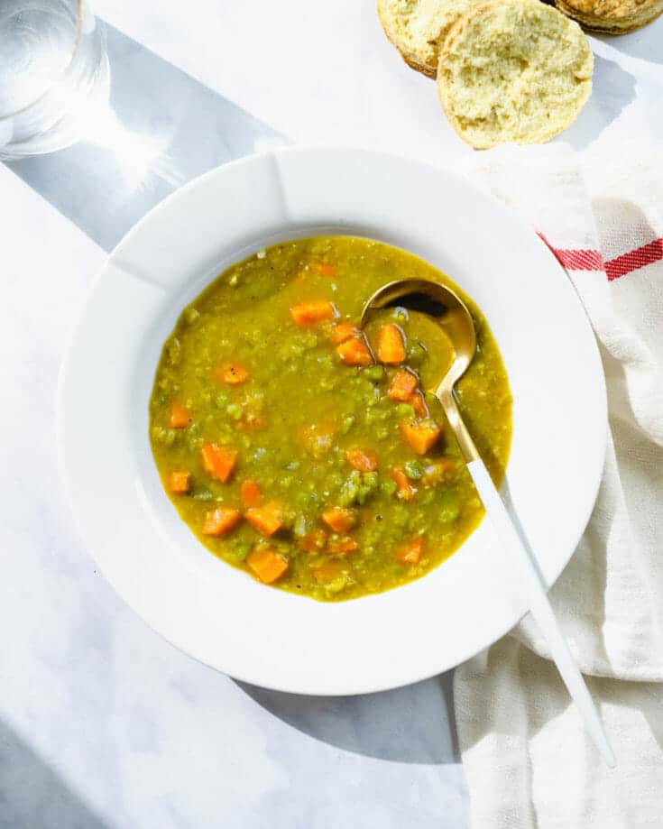 This vegetarian Instant Pot split pea soup recipe is the ultimate meal! It’s filling, plant based, and easy to make in a pressure cooker. Full of cozy, lightly smoky flavor, all that's required is chopping 3 veggies: onion, celery and carrot. That's it! Let your Instant Pot do the rest of the work.