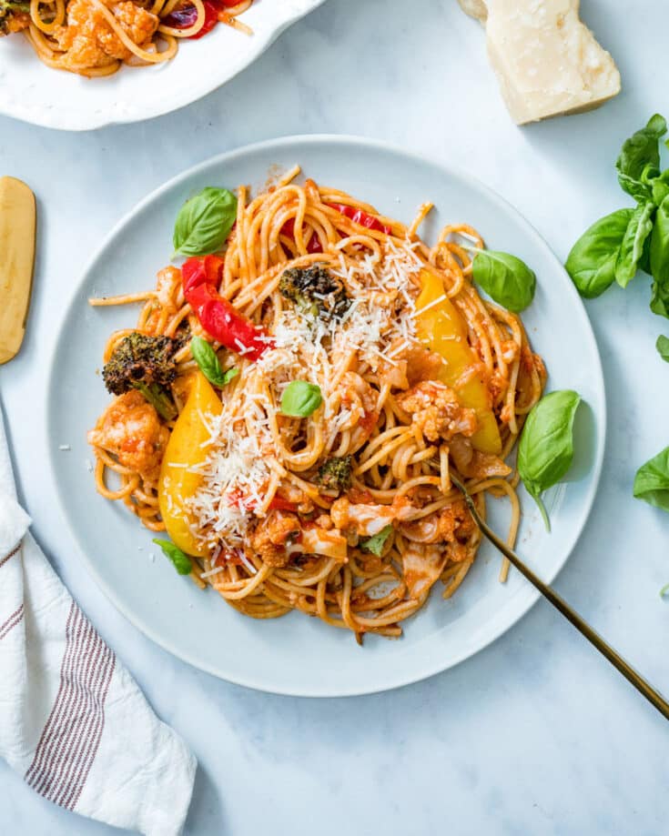 No matter how many healthy, easy dinner ideas we have in our repertoire, we’re always in need of another. Here’s an idea for loading up on good stuff: meet this Vegetable Pasta! It’s a combination between cozy comfort food and a vegetable-powered healthy meal, pairing roasted vegetables with bright marinara and Parmesan cheese.