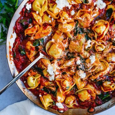 First up in our vegetarian pasta recipes: try this cheese tortellini in creamy marinara sauce! In just 15 minutes, you’ve got a pasta skillet that’s a literal symphony of flavor. The fresh basil-infused marinara sauce is perfectly complimented with pillows of tangy goat cheese. This one is a massive hit in our house…and we hope it will be in yours too!