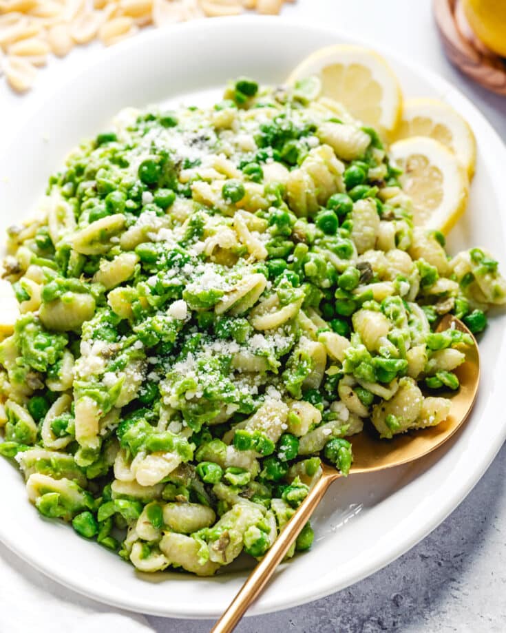 Try this bright and beautiful pasta with peas recipe, ready in just 20 minutes with a handful of ingredients! The flavor is fresh, zingy and positively delightful. You'll mash some of the peas with capers, lemon, garlic, and Pecorino cheese to make a creamy sauce, then add additional peas and garnish with more Pecorino.